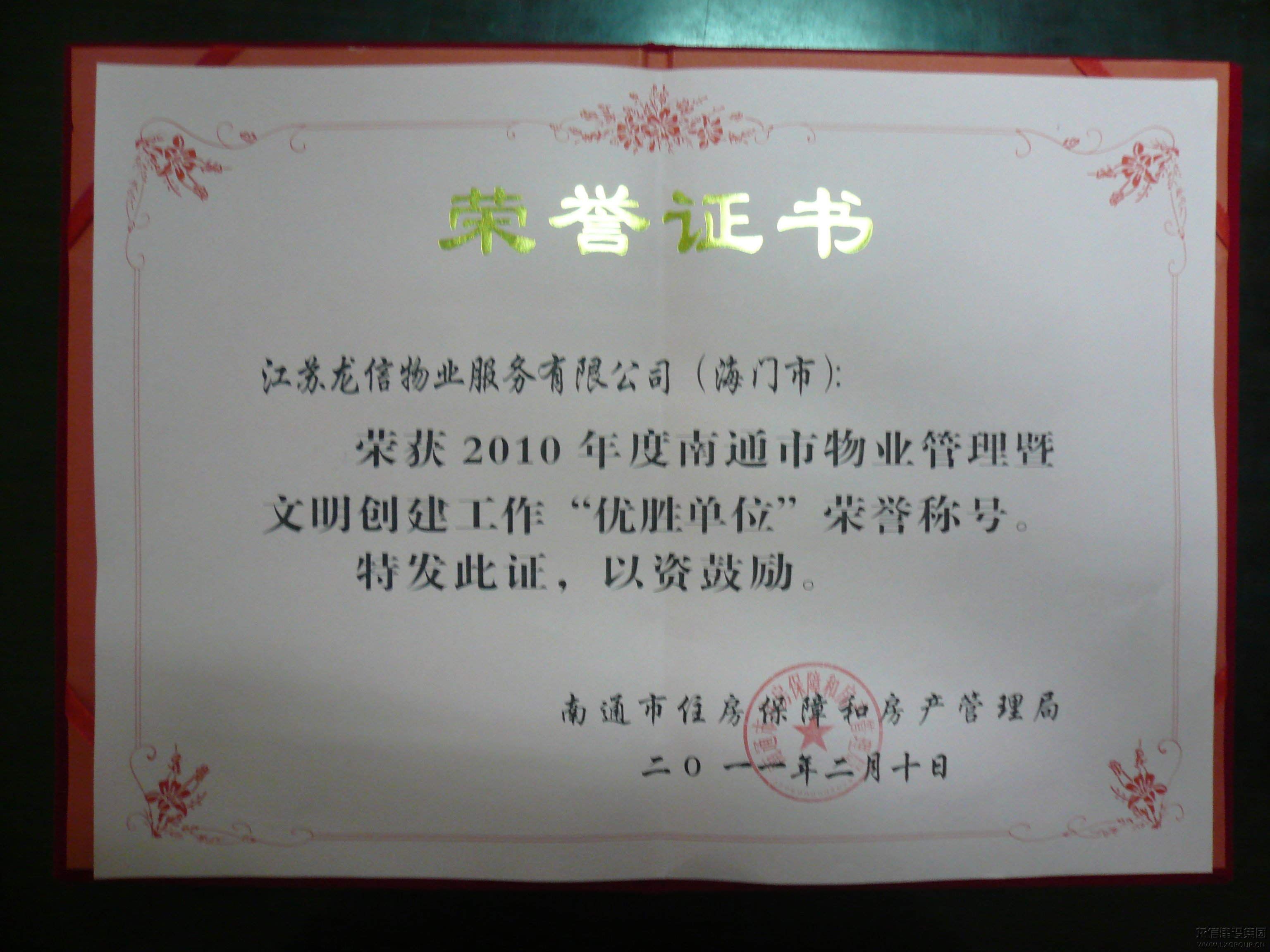 日前,在南通市房管局組織的物業行業大會上,江蘇龍信物業被評為2010年度“南通市物業管理優勝單位”;同時,海門“運杰龍馨園”也捧回了2010年度“南通市物業管理優秀小區”的獎牌。