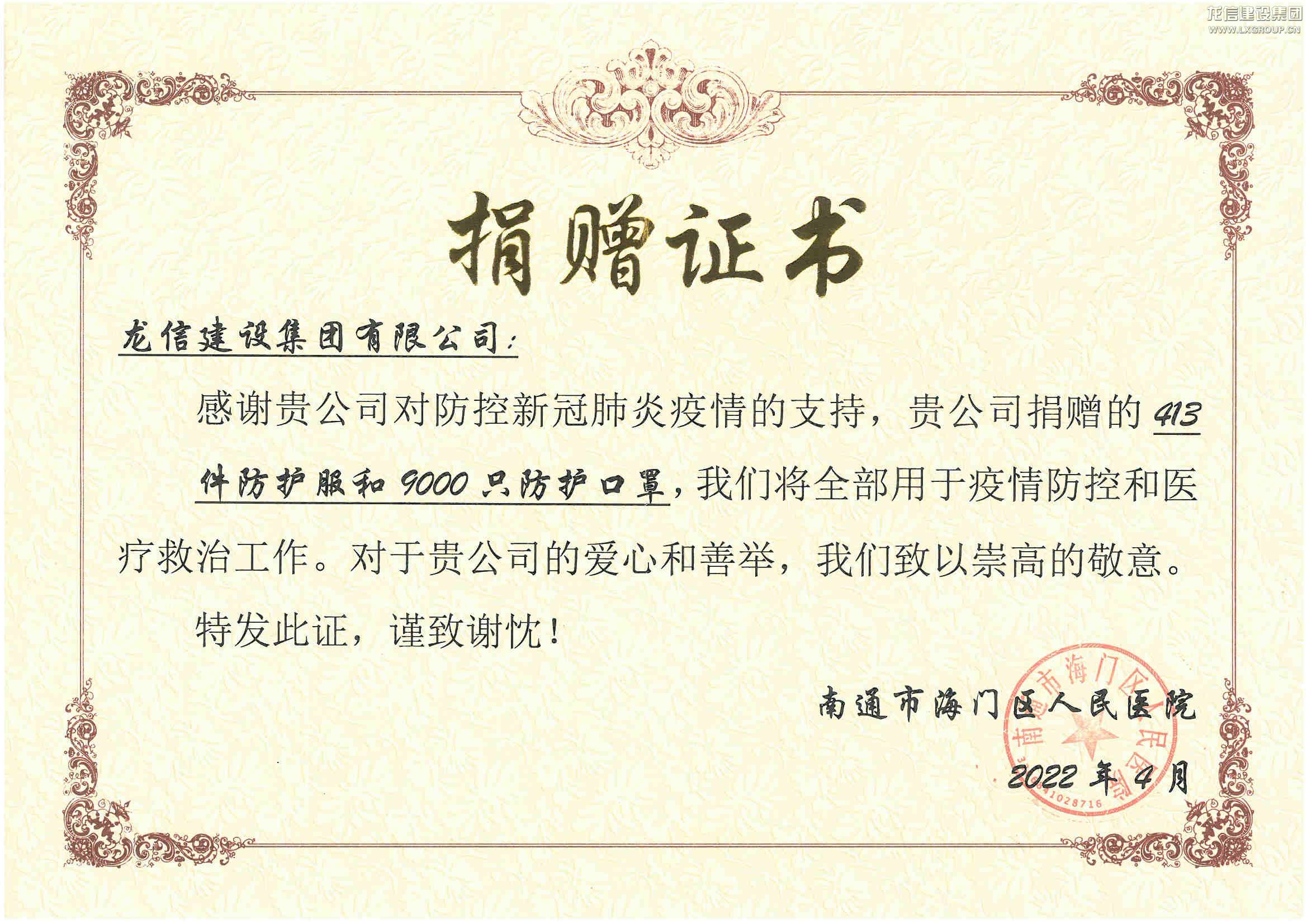疫情無情,人間有愛,作為海門本土企業,本輪疫情一直牽動著龍信集團廣大員工的心。龍信集團積極助力家鄉疫情防控工作,以實際行動支持全區的戰“疫”工作,用行動彰顯企業責任和擔當。3月底,龍信建設集團江蘇紫浪裝飾裝璜有限公司500多名建設者迅速集結,在歷經5個晝夜連續作戰后,完成海門老人民醫院240間病房、375個床位的改造,助力提升家鄉公共衛生應急處置能力。4月11日,集團黨委將集團員工15萬元個人捐款,購買了醫用防護服、KN95醫用口罩等防疫物資,捐贈給南通市海門區人民醫院。4月15日,集團黨委向黨建結盟的八烈村捐贈口罩、礦泉水等防疫物資。
